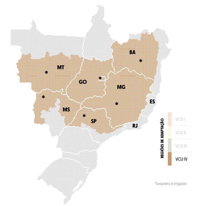 - Recomendada para cultivo em sistema de sequeiro, com excelente desempenho também em áreas irrigadas bem manejadas.