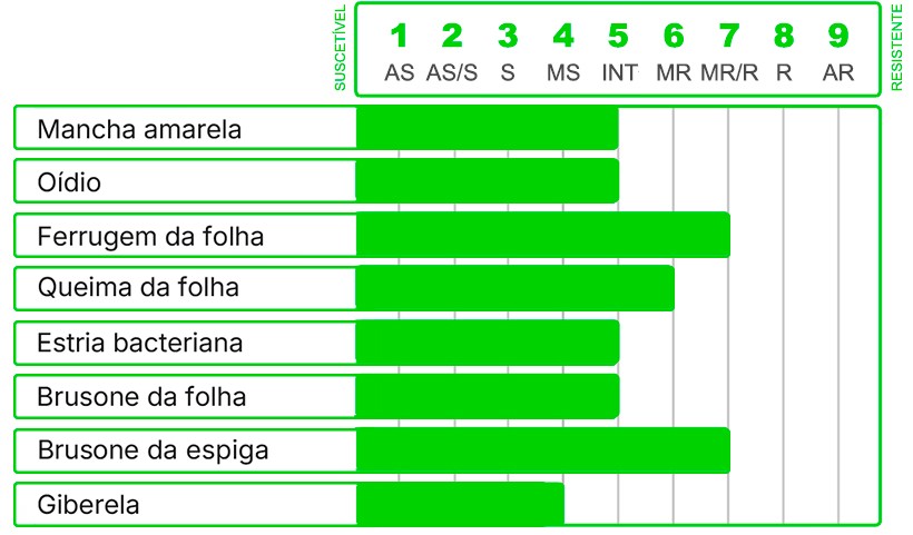 Com arquitetura de planta baixa e excelente resposta ao uso de regulador de crescimento, o TBIO Calibre combina sanidade, precocidade e qualidade industrial. Apresenta resistência equilibrada às principais doenças da cultura, especialmente à brusone da espiga, sendo uma escolha estratégica para áreas com histórico de pressão da doença. Seu perfil também inclui ótimo peso de grãos, boa coloração de farinha e performance compatível com exigências industriais.